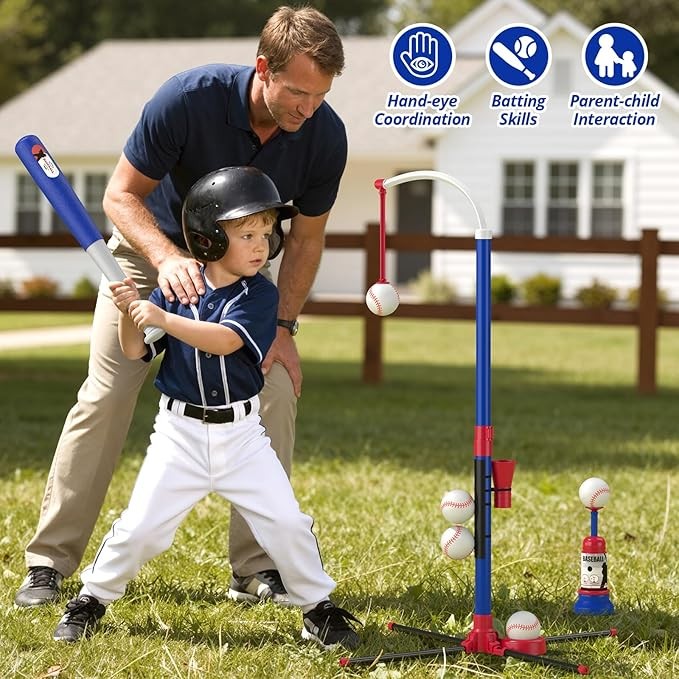 3 WAYS TO PLAY - ①Hanging Tee: Baseballs with self-stick covers and can be hung anywhere from 15" to 30" off the ground. The novel hanging tee brings more fun for kids! ②Fixed Standing Tee: The traditional tee can better help kids practice how to hit the ball. ③Automatic Launcher: Very easy to use, child only needs to hit an automatically ejected baseball