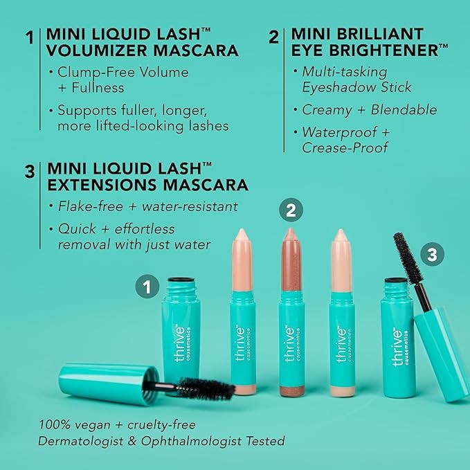 Thrive Causemetics Mini Makeup Essentials, Gift Set for Women, Deluxe Mini Liquid Lash Extensions & Volumizer Mini Mascaras, Brynn (Rich Black), Mini Eye Brightener Highlighter Sticks - 3 Shades